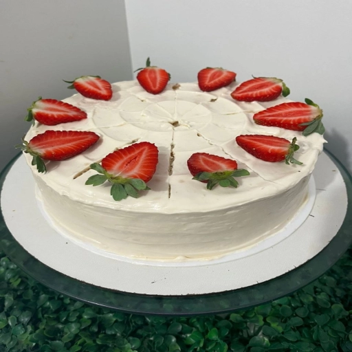 massa de baunilha sem açucar, sem gluten, recheada c/ brigadeiro de leite ninho e morangos frescos. (ALERGICOS; RISCO D... Ver completo