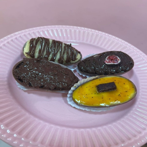 base de leite ninho, recheio de geleia de framboesa e casquinha de chocolate meio amargo